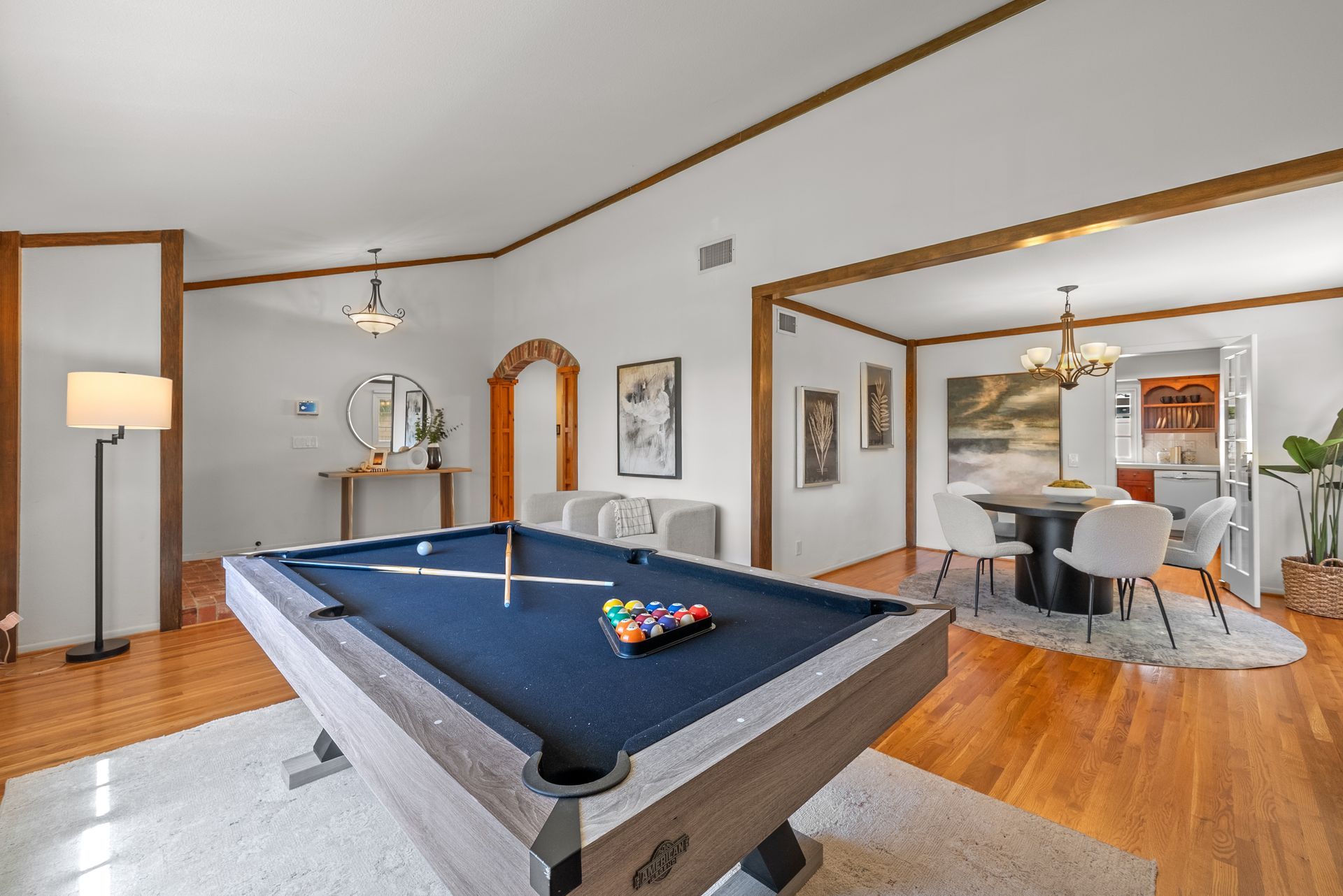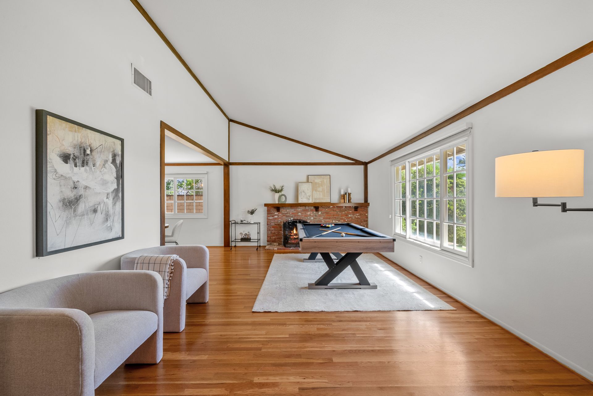 The open-concept living space flows seamlessly into the warm and inviting kitchen, complete with rich wood cabinetry, vaulted beams, and classic craftsmanship. It’s a space that feels equal parts cozy and expansive—perfect for everyday living and entertaining.