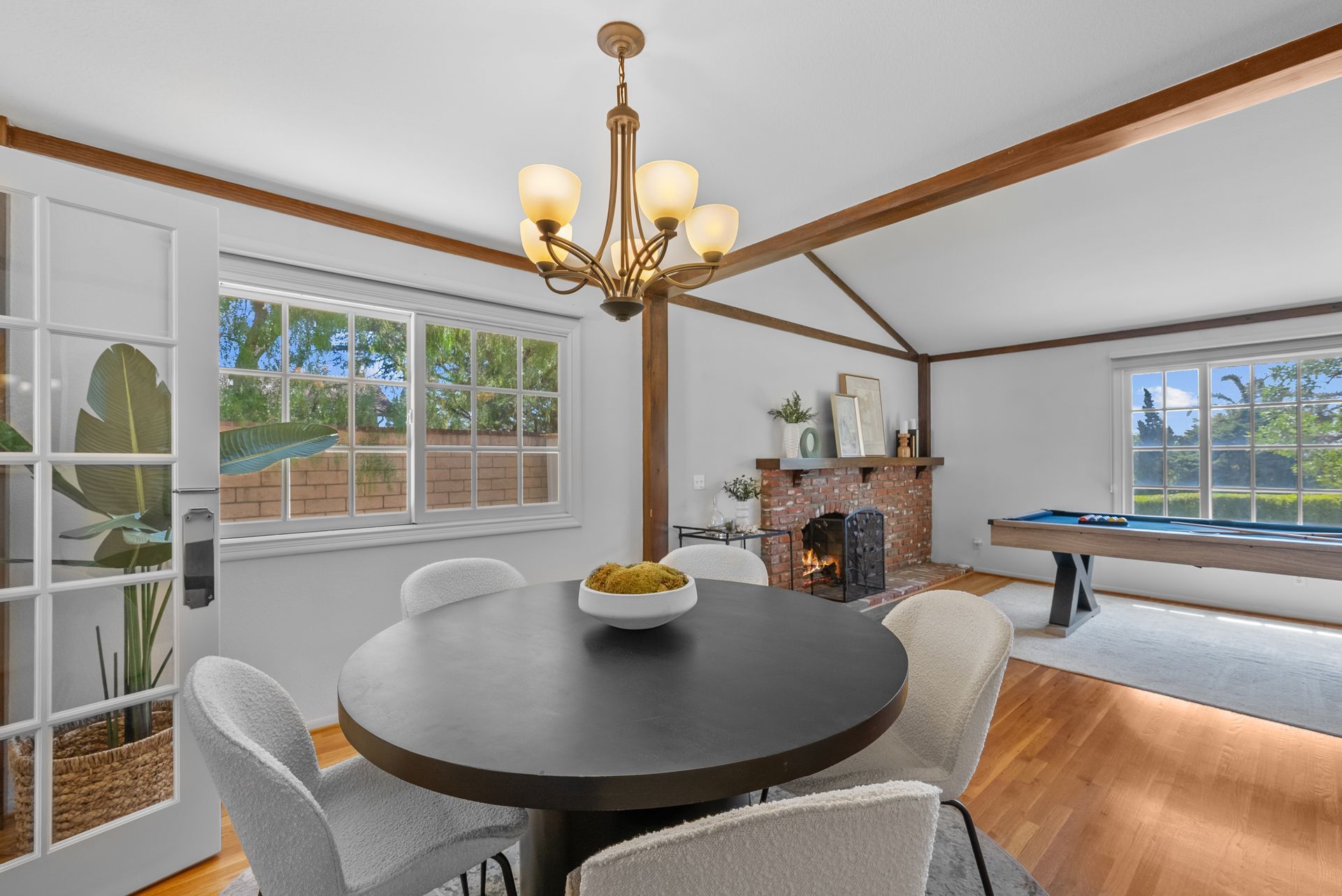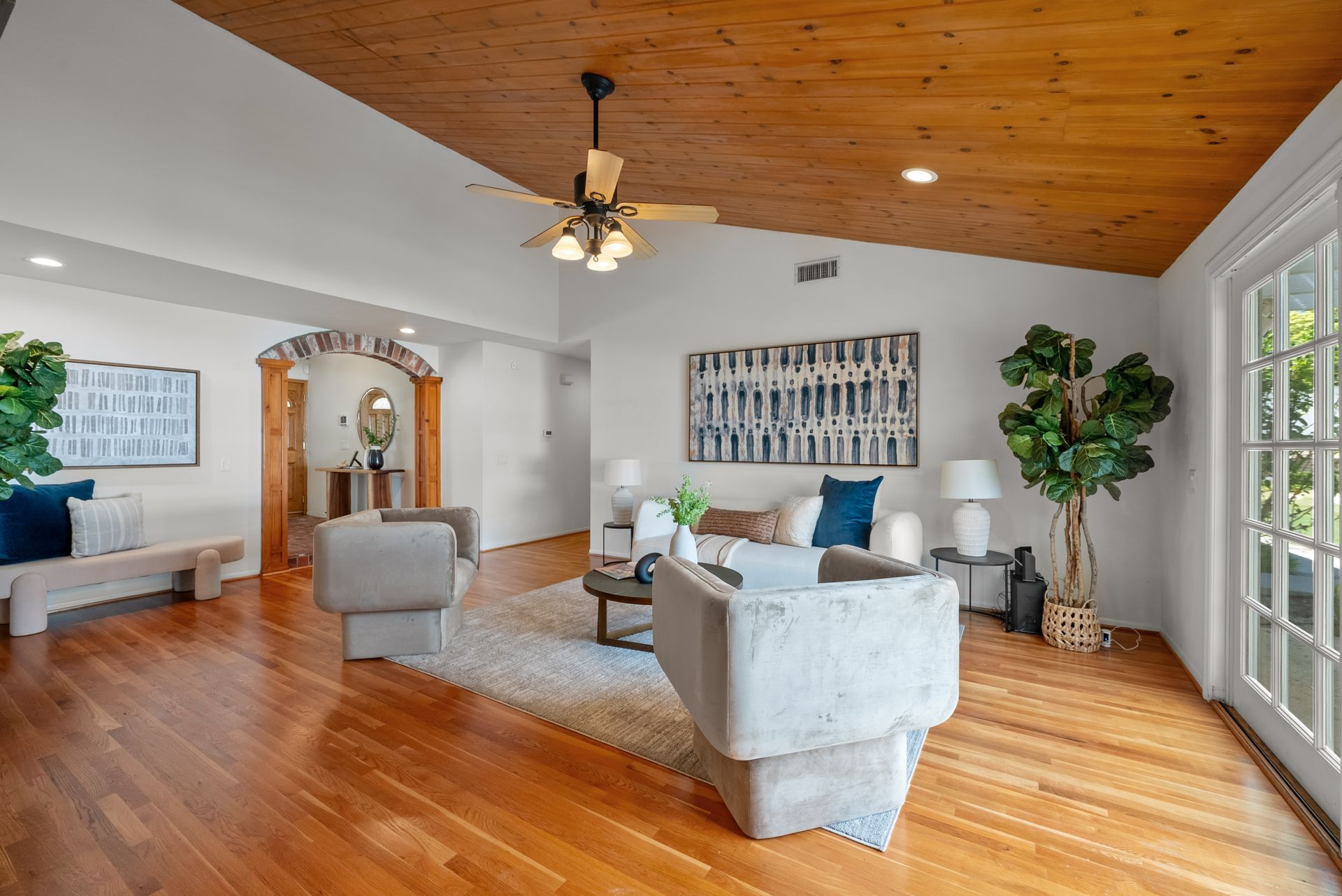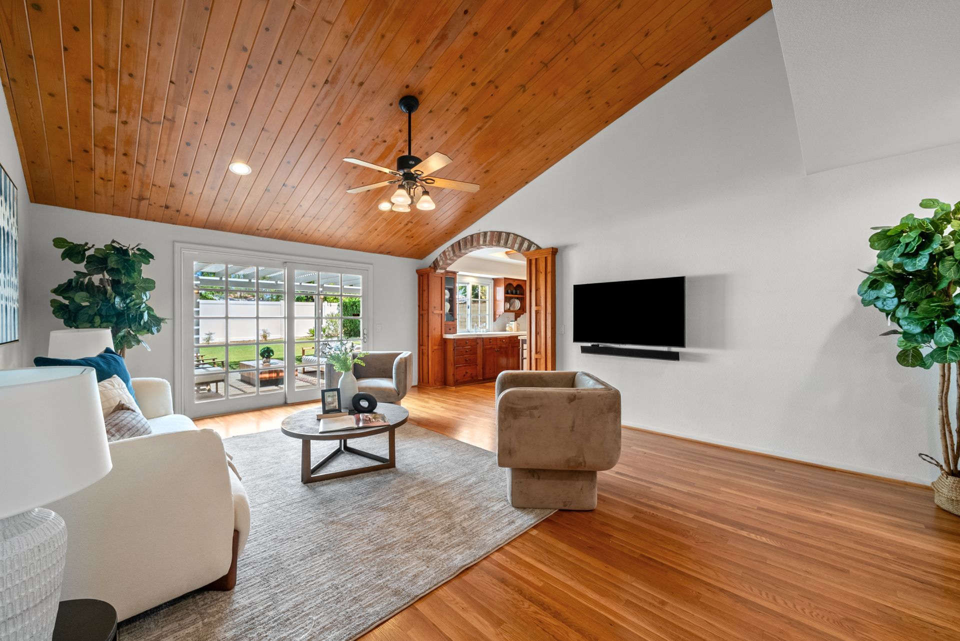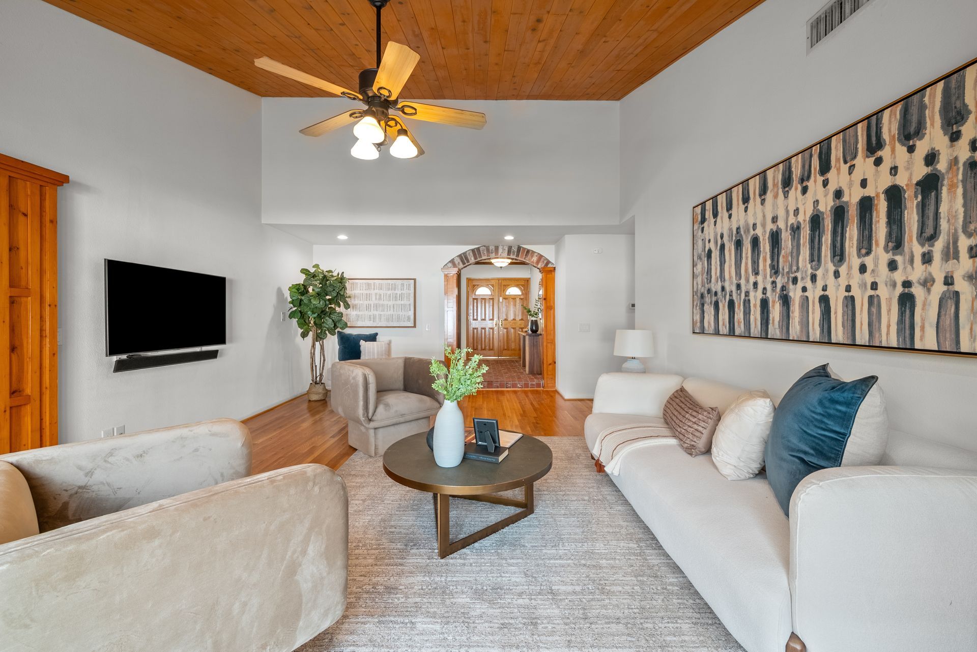 From the moment you step through the double front doors, you're greeted by soaring wood-planked ceilings and arched brick accents that immediately set this home apart. Natural light pours in through large windows and sliding glass doors, drawing your eye to the lush backyard oasis.