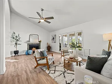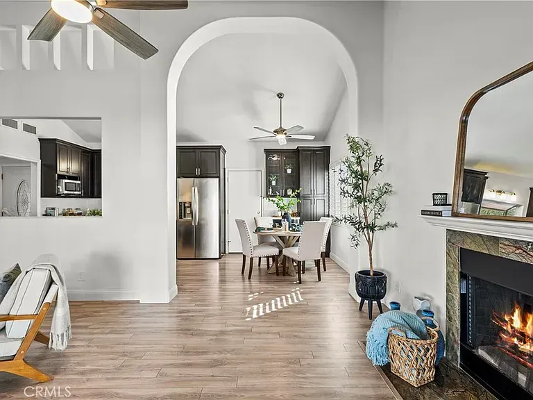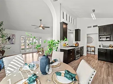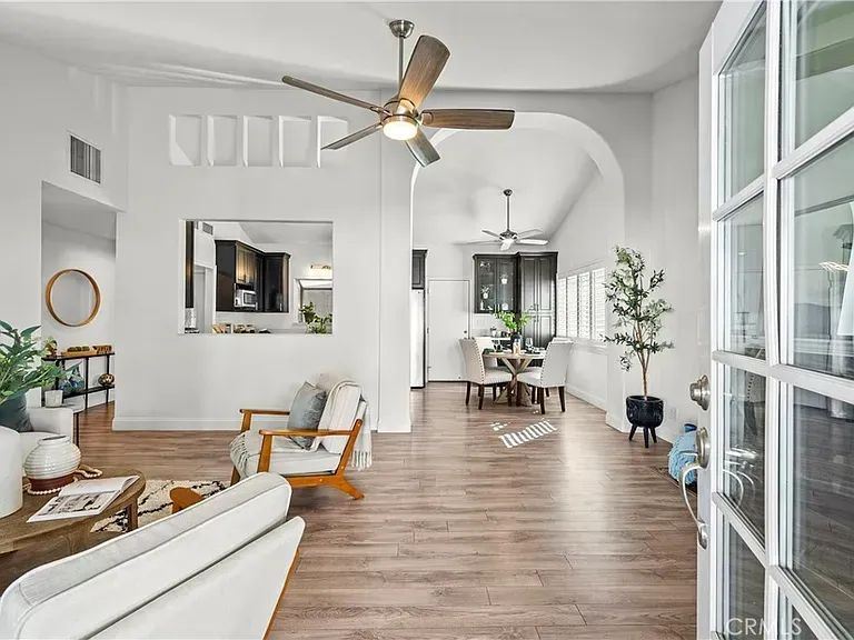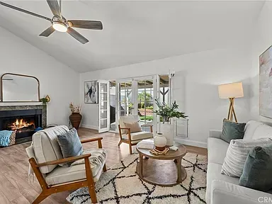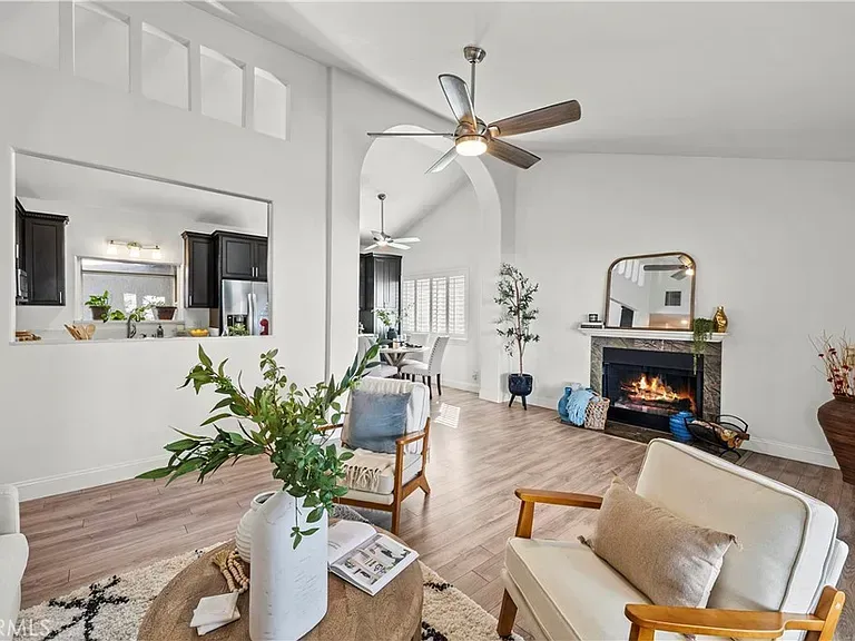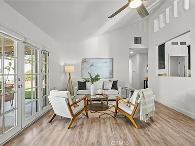 Step inside to an abundance of natural light, high ceilings, and a fresh, modern feel. The newly painted interior and updated kitchen create a bright, inviting space that flows seamlessly through the open floor plan. French doors lead to your own private backyard oasis with a covered patio and lush lawn, offering a serene setting for relaxing or entertaining.