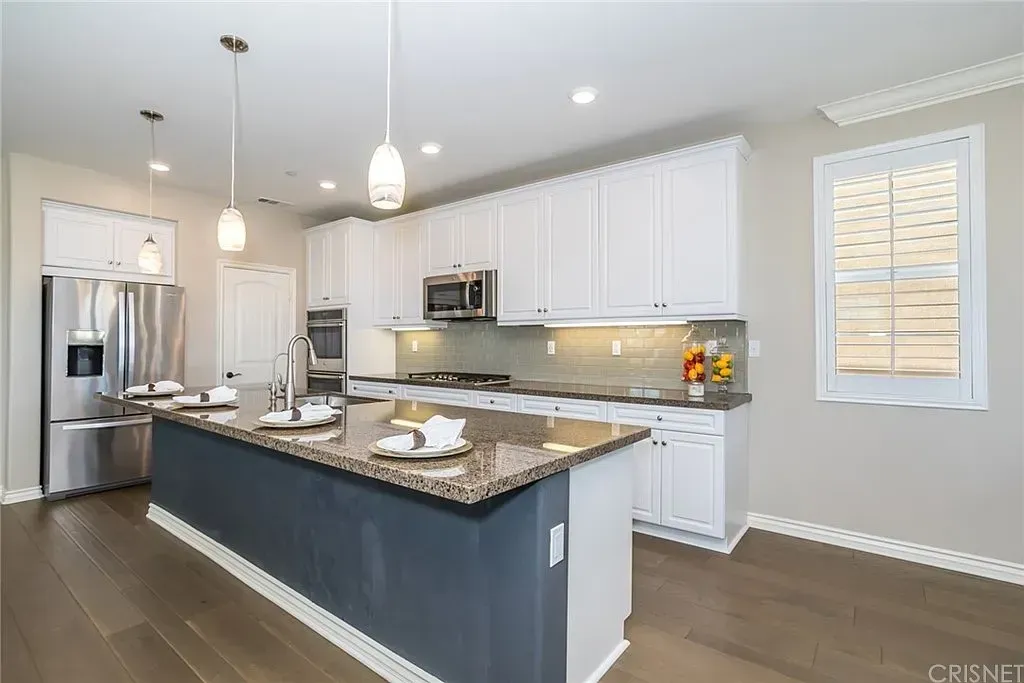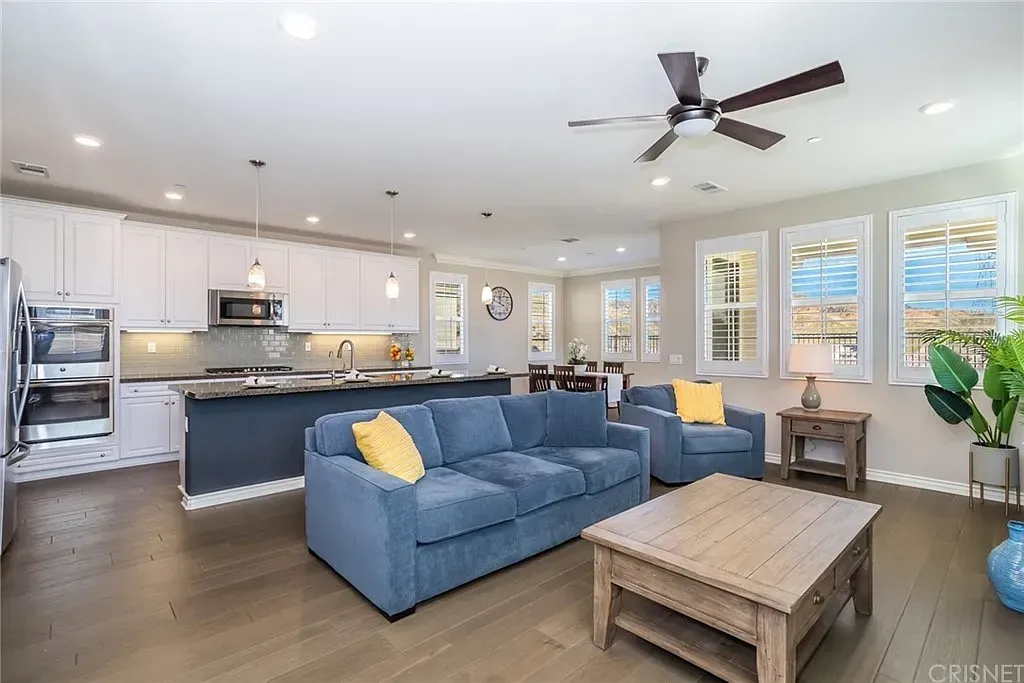 This Turn-Key Home is a MUST SEE! Nestled in the prestigious and very sought-after Gated West Hills-Valencia offering a Master Balcony with Breathtaking views. This Newer, popular open floor plan of this beautiful two story home features a full bedroom & bath downstairs, along with another half bath for guests. Hard wood floors throughout. Chefs Kitchen with Large Center Island, Granite counters, Subway tile backsplash, Stylish cabinets, Pantry, and Stainless Steel appliances. Kitchen is part of the Great Room with Cozy Fireplace that is perfect ambiance to entertain guests. 2nd Floor features has large open loft, Walk-In Linen Closet, 3 Bedrooms, Full Hall Bath with double sink. Enter primary suite with retreat & primary Bath has double sinks, separate tub & shower, walk-in closet. Balcony has Extraordinary View of Mountains and City lights. Backyard is perfect for entertaining on all new pavers and hardscape. Some additional features include wood shutters, ceiling fans, recessed lighting, wood floors, energy efficient windows, tankless water heater, Ring security cameras. Partial Solar is FULLY PAID = Huge Utility Savings. Resort Style Valencia Living at its finest! West Hills HOA has 3 Pools, walking distance to the Retreat Lodge Pool, Clubhouse, SportsPark, Playground, BBQ, Paseo Trails, PLUS Top rated West Creek Academy Elementary School and Rio Norte Jr High is walking distance. This Beautiful Home will not last!!